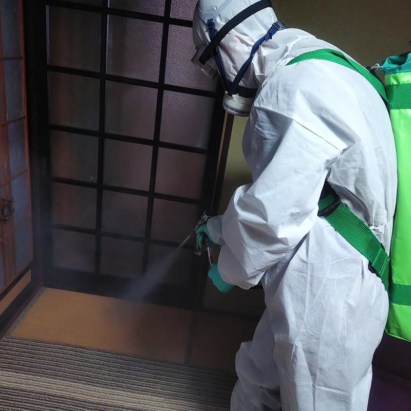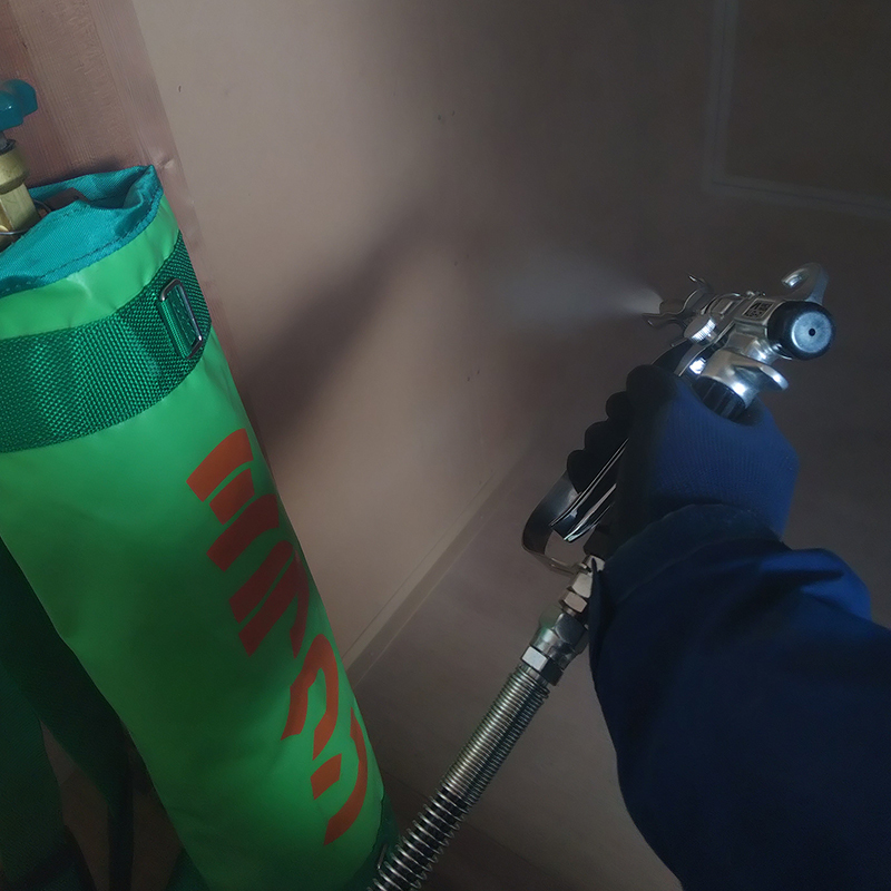 ULV機やアクチゾール機を用いて薬剤を微粒子状にし、隙間や空間に噴霧します。隙間に潜むゴキブリの追い出しが可能です。追い出されたゴキブリを徘徊する間に微粒子に接触させ駆除します。