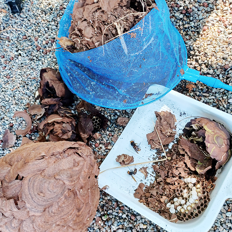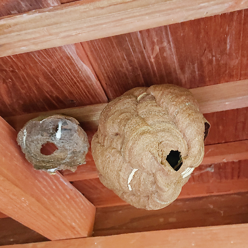 各種ハチは庭木・軒下・室外機・壁内など様々な場所に巣を作り非常に危険です。専用の防護服を着用し、安全確認を行った上で駆除作業を行います。